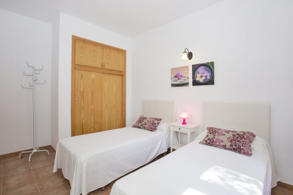 Das freundliche Schlafzimmer mit Klimaanlage, hat 2 Einzelbetten und einen Wandschrank.