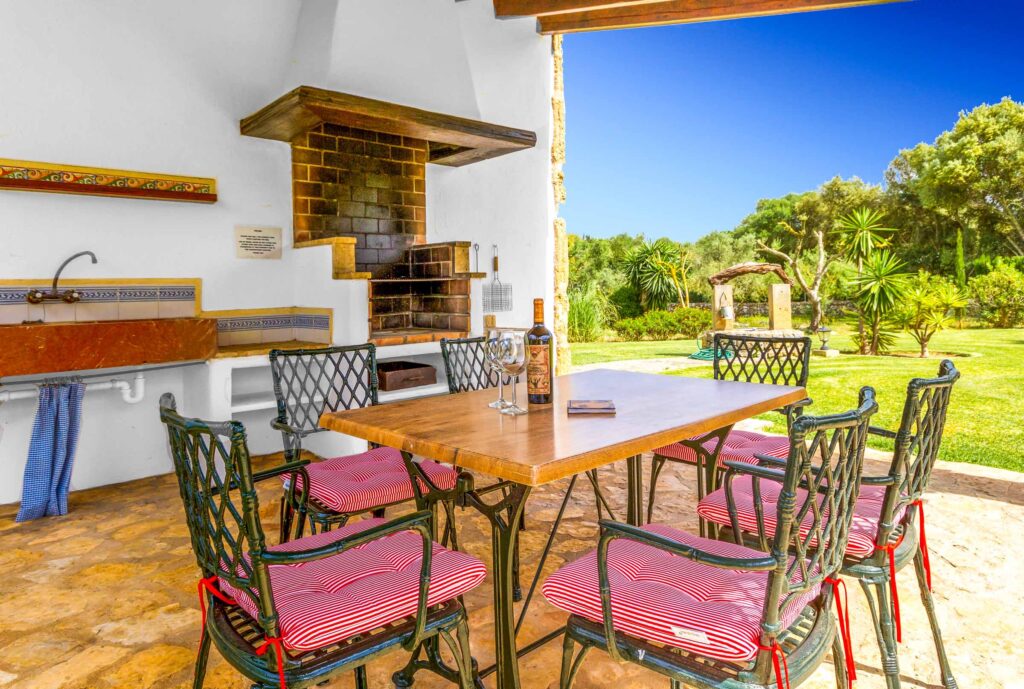Die aus Stein gebaute Aussenküche mit Grill hat eine überdachte Terrasse mit Blick auf den Pool und die Gärten, ein idealer Ort für entspannte Mittagessen und Siestas am Nachmittag, während die Kinder sicher im umzäunten Garten spielen können. Für Sportbegeisterte steht eine Tischtennis-Platte zur Verfügung.