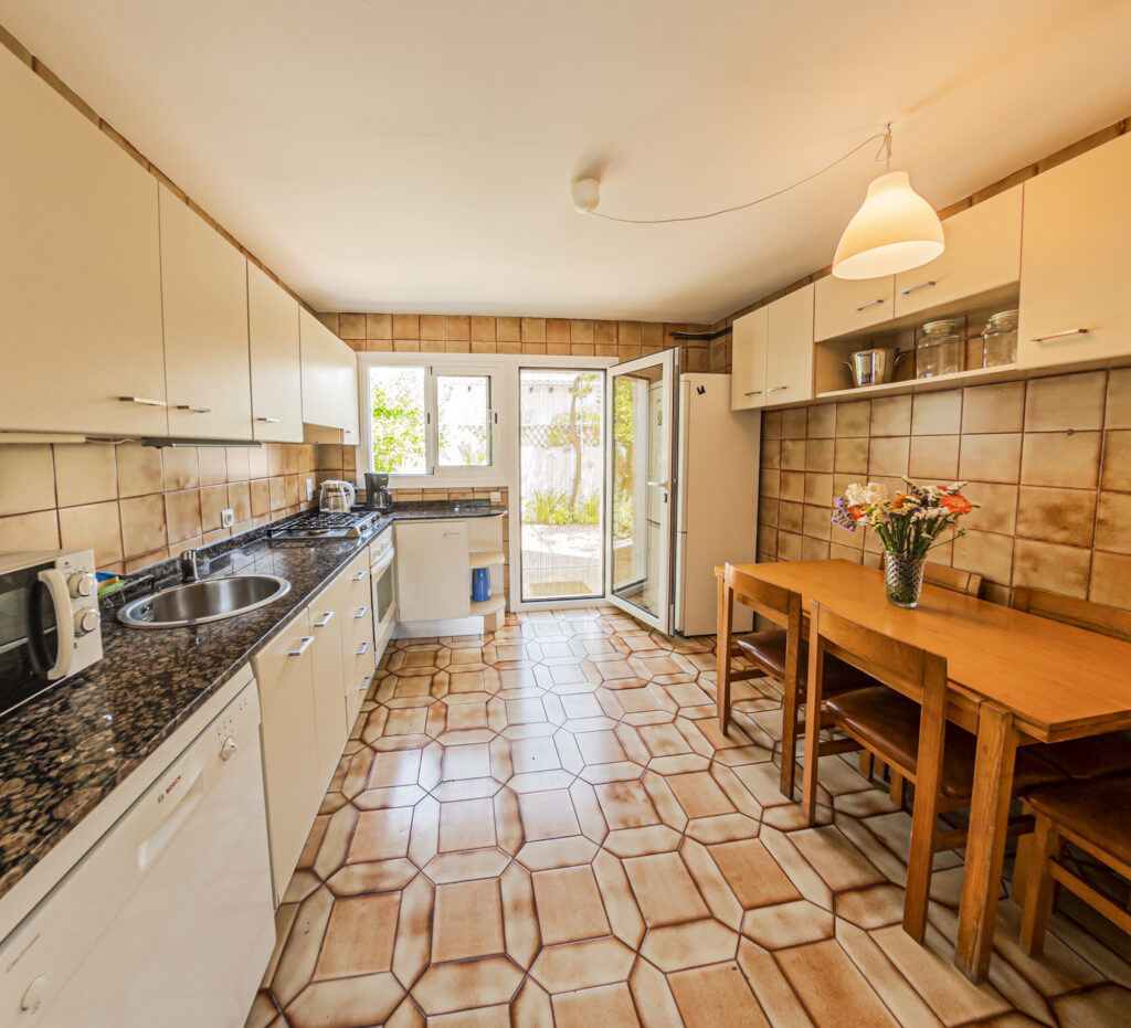 Die moderne Einbauküche verfügt über einen Gasherd mit Backofen, Kühlschrank mit Gefrierfach, Geschirrspüler, Mikrowelle, Kaffeemaschine. Auch von hier aus gelangen die Gäste über eine Glastür auf die Terrasse hinter dem Haus.