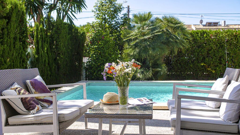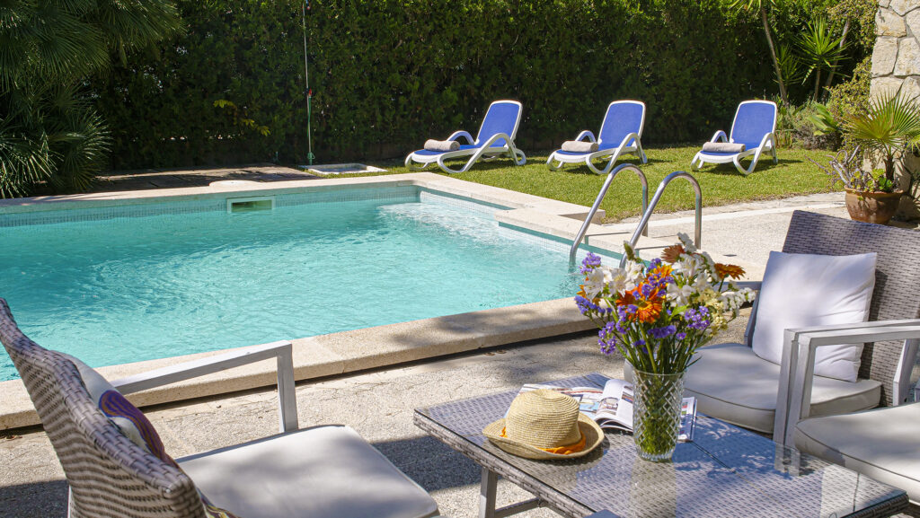 Der kleine Pool (5×5 m) liegt im gepflegten Garten, umgeben von gefliesten Terrassen und mediterranen Bäumen, Büschen und Blumen.
